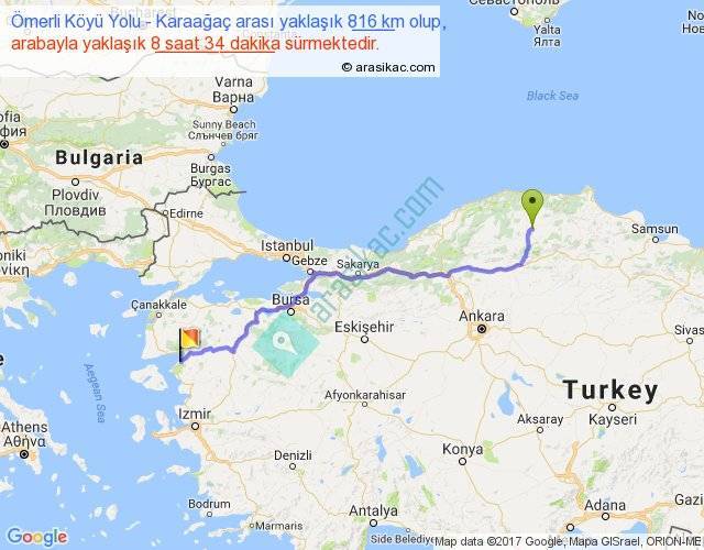 Ömerli Köyü Yolu - Karaağaç arası yaklaşık olarak 90 km/h ile yukarıda belirtilen sürede olup, iki yerin kuş uçuşu uzaklığı (mesafesi) 630'dir. Eğer belirtilen yerler arasında uçak seferi var ise bu süre uçakla 58 dakika'ya kadar düşebilir. Yolculuk otobüsle 11 saat 8 dakika sürmektedir.