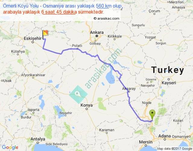 Ömerli Köyü Yolu - Osmaniye arası yaklaşık olarak 90 km/h ile yukarıda belirtilen sürede olup, iki yerin kuş uçuşu uzaklığı (mesafesi) 427'dir. Eğer belirtilen yerler arasında uçak seferi var ise bu süre uçakla 39 dakika'ya kadar düşebilir. Yolculuk otobüsle 8 saat 46 dakika sürmektedir.