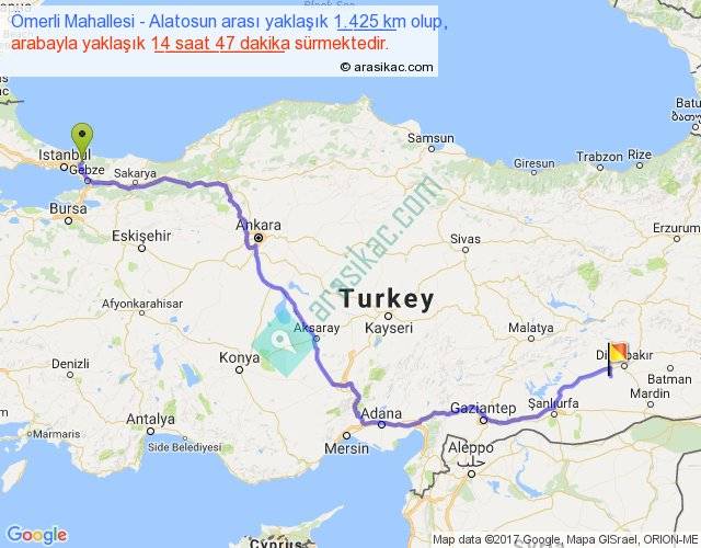 Ömerli Mahallesi - Alatosun arası yaklaşık olarak 90 km/h ile yukarıda belirtilen sürede olup, iki yerin kuş uçuşu uzaklığı (mesafesi) 975'dir. Eğer belirtilen yerler arasında uçak seferi var ise bu süre uçakla 1 saat 30 dakika'ya kadar düşebilir. Yolculuk otobüsle 19 saat 13 dakika sürmektedir.
