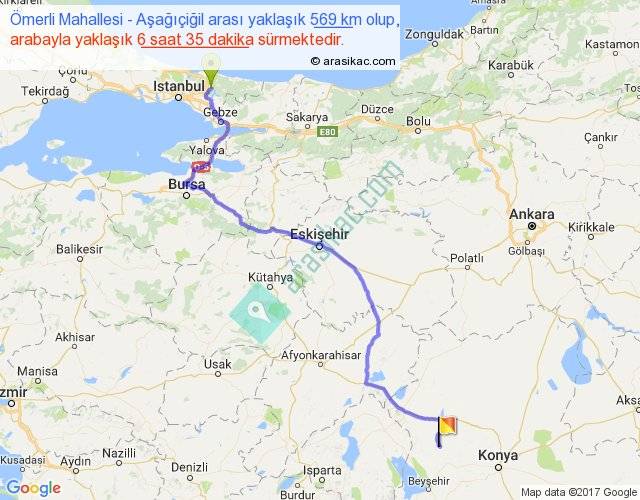 Ömerli Mahallesi - Aşağıçiğil arası yaklaşık olarak 90 km/h ile yukarıda belirtilen sürede olup, iki yerin kuş uçuşu uzaklığı (mesafesi) 397'dir. Eğer belirtilen yerler arasında uçak seferi var ise bu süre uçakla 36 dakika'ya kadar düşebilir. Yolculuk otobüsle 8 saat 33 dakika sürmektedir.