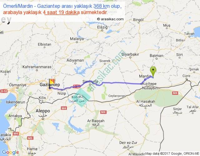 Ömerli Mardin - Gaziantep arası yaklaşık olarak 90 km/h ile yukarıda belirtilen sürede olup, iki yerin kuş uçuşu uzaklığı (mesafesi) 321'dir. Eğer belirtilen yerler arasında uçak seferi var ise bu süre uçakla 29 dakika'ya kadar düşebilir. Yolculuk otobüsle 5 saat 36 dakika sürmektedir.