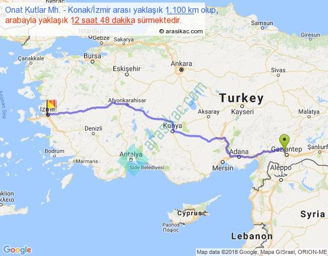 Onat Kutlar Mh. - Konak İzmir arası yaklaşık olarak 90 km/h ile yukarıda belirtilen sürede olup, iki yerin kuş uçuşu uzaklığı (mesafesi) 897'dir. Eğer belirtilen yerler arasında uçak seferi var ise bu süre uçakla 1 saat 22 dakika'ya kadar düşebilir. Yolculuk otobüsle 16 saat 38 dakika sürmektedir.