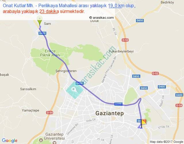 Onat Kutlar Mh. - Perilikaya Mahallesi arası yaklaşık olarak 90 km/h ile yukarıda belirtilen sürede olup, iki yerin kuş uçuşu uzaklığı (mesafesi) 15'dir. Yolculuk otobüsle 29 dakika sürmektedir.