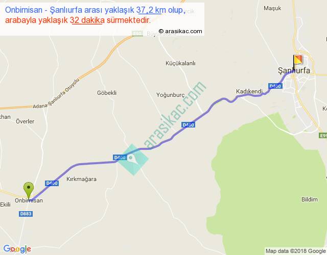 Onbirnisan - Şanlıurfa arası yaklaşık olarak 90 km/h ile yukarıda belirtilen sürede olup, iki yerin kuş uçuşu uzaklığı (mesafesi) 35'dir. Yolculuk otobüsle 41 dakika sürmektedir.