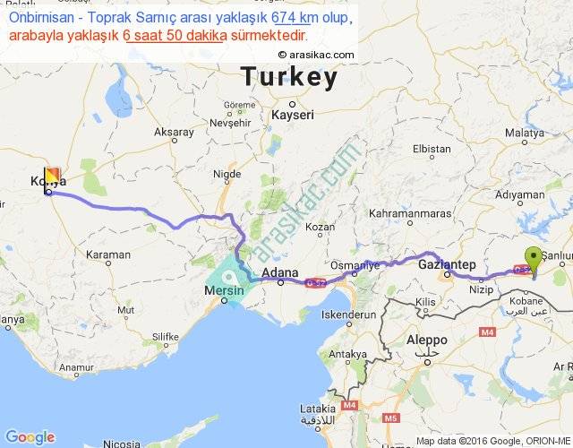 Onbirnisan - Toprak Sarnıç arası yaklaşık olarak 90 km/h ile yukarıda belirtilen sürede olup, iki yerin kuş uçuşu uzaklığı (mesafesi) 533'dir. Eğer belirtilen yerler arasında uçak seferi var ise bu süre uçakla 49 dakika'ya kadar düşebilir. Yolculuk otobüsle 8 saat 53 dakika sürmektedir.