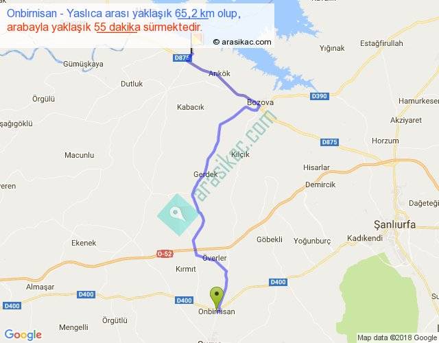Onbirnisan - Yaslıca arası yaklaşık olarak 90 km/h ile yukarıda belirtilen sürede olup, iki yerin kuş uçuşu uzaklığı (mesafesi) 46'dir. Yolculuk otobüsle 1 saat 11 dakika sürmektedir.