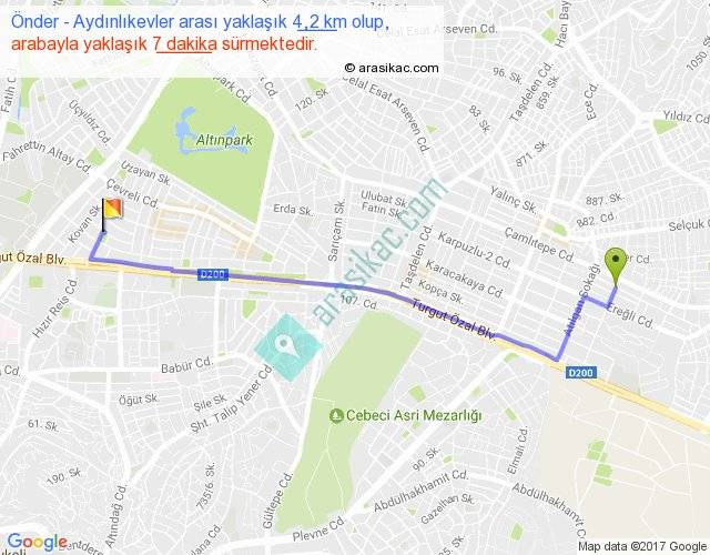 Önder - Aydınlıkevler arası yaklaşık olarak 90 km/h ile yukarıda belirtilen sürede olup, iki yerin kuş uçuşu uzaklığı (mesafesi) 3'dir. Yolculuk otobüsle 9 dakika sürmektedir.