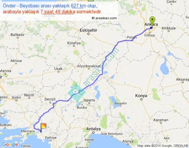 Önder - Beyobası arası yaklaşık olarak 90 km/h ile yukarıda belirtilen sürede olup, iki yerin kuş uçuşu uzaklığı (mesafesi) 492'dir. Eğer belirtilen yerler arasında uçak seferi var ise bu süre uçakla 45 dakika'ya kadar düşebilir. Yolculuk otobüsle 10 saat 5 dakika sürmektedir.