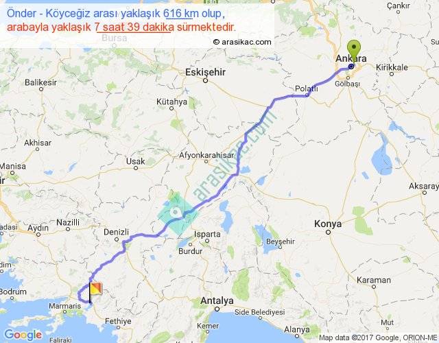 Önder - Köyceğiz arası yaklaşık olarak 90 km/h ile yukarıda belirtilen sürede olup, iki yerin kuş uçuşu uzaklığı (mesafesi) 492'dir. Eğer belirtilen yerler arasında uçak seferi var ise bu süre uçakla 45 dakika'ya kadar düşebilir. Yolculuk otobüsle 9 saat 56 dakika sürmektedir.
