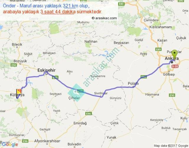 Önder - Maruf arası yaklaşık olarak 90 km/h ile yukarıda belirtilen sürede olup, iki yerin kuş uçuşu uzaklığı (mesafesi) 257'dir. Eğer belirtilen yerler arasında uçak seferi var ise bu süre uçakla 23 dakika'ya kadar düşebilir. Yolculuk otobüsle 4 saat 51 dakika sürmektedir.