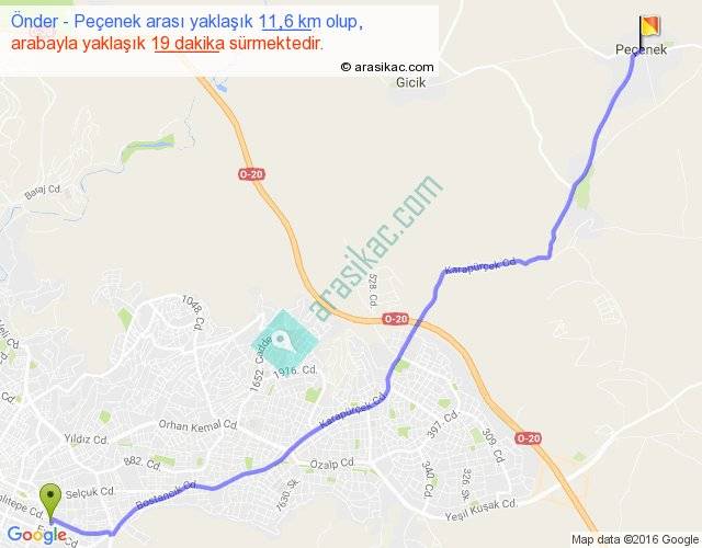 Önder - Peçenek arası yaklaşık olarak 90 km/h ile yukarıda belirtilen sürede olup, iki yerin kuş uçuşu uzaklığı (mesafesi) 10'dir. Yolculuk otobüsle 24 dakika sürmektedir.
