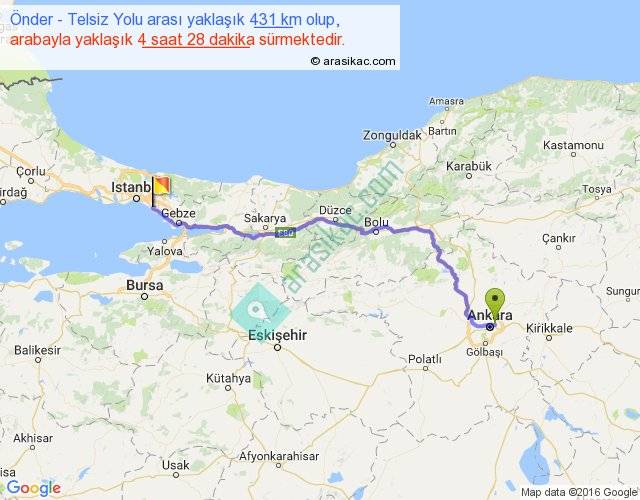 Önder - Telsiz Yolu arası yaklaşık olarak 90 km/h ile yukarıda belirtilen sürede olup, iki yerin kuş uçuşu uzaklığı (mesafesi) 333'dir. Eğer belirtilen yerler arasında uçak seferi var ise bu süre uçakla 30 dakika'ya kadar düşebilir. Yolculuk otobüsle 5 saat 48 dakika sürmektedir.