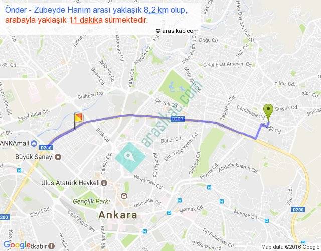 Önder - Zübeyde Hanım arası yaklaşık olarak 90 km/h ile yukarıda belirtilen sürede olup, iki yerin kuş uçuşu uzaklığı (mesafesi) 6'dir. Yolculuk otobüsle 14 dakika sürmektedir.