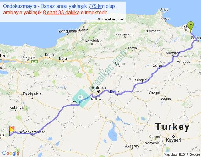 Ondokuzmayıs - Banaz arası yaklaşık olarak 90 km/h ile yukarıda belirtilen sürede olup, iki yerin kuş uçuşu uzaklığı (mesafesi) 615'dir. Eğer belirtilen yerler arasında uçak seferi var ise bu süre uçakla 56 dakika'ya kadar düşebilir. Yolculuk otobüsle 11 saat 6 dakika sürmektedir.