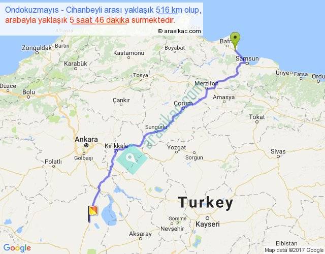 Ondokuzmayıs - Cihanbeyli arası yaklaşık olarak 90 km/h ile yukarıda belirtilen sürede olup, iki yerin kuş uçuşu uzaklığı (mesafesi) 412'dir. Eğer belirtilen yerler arasında uçak seferi var ise bu süre uçakla 38 dakika'ya kadar düşebilir. Yolculuk otobüsle 7 saat 29 dakika sürmektedir.