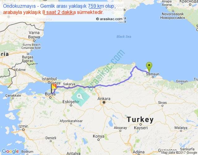 Ondokuzmayıs - Gemlik arası yaklaşık olarak 90 km/h ile yukarıda belirtilen sürede olup, iki yerin kuş uçuşu uzaklığı (mesafesi) 590'dir. Eğer belirtilen yerler arasında uçak seferi var ise bu süre uçakla 54 dakika'ya kadar düşebilir. Yolculuk otobüsle 10 saat 26 dakika sürmektedir.