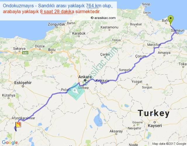Ondokuzmayıs - Sandıklı arası yaklaşık olarak 90 km/h ile yukarıda belirtilen sürede olup, iki yerin kuş uçuşu uzaklığı (mesafesi) 595'dir. Eğer belirtilen yerler arasında uçak seferi var ise bu süre uçakla 54 dakika'ya kadar düşebilir. Yolculuk otobüsle 11 saat 0 dakika sürmektedir.
