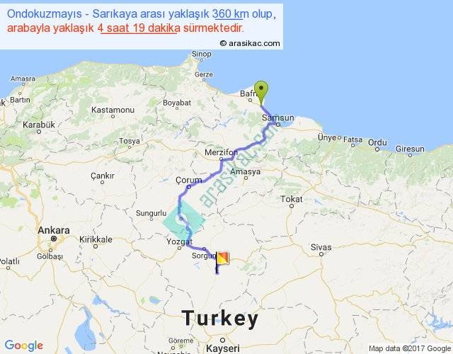 Ondokuzmayıs - Sarıkaya arası yaklaşık olarak 90 km/h ile yukarıda belirtilen sürede olup, iki yerin kuş uçuşu uzaklığı (mesafesi) 225'dir. Yolculuk otobüsle 5 saat 36 dakika sürmektedir.
