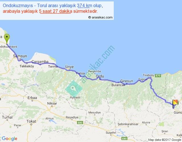 Ondokuzmayıs - Torul arası yaklaşık olarak 90 km/h ile yukarıda belirtilen sürede olup, iki yerin kuş uçuşu uzaklığı (mesafesi) 287'dir. Eğer belirtilen yerler arasında uçak seferi var ise bu süre uçakla 26 dakika'ya kadar düşebilir. Yolculuk otobüsle 7 saat 5 dakika sürmektedir.