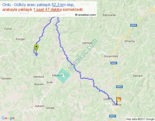 Ordu - Gölköy arası yaklaşık olarak 90 km/h ile yukarıda belirtilen sürede olup, iki yerin kuş uçuşu uzaklığı (mesafesi) 40'dir. Yolculuk otobüsle 1 saat 53 dakika sürmektedir.