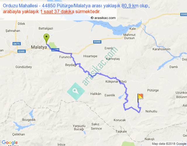Orduzu Mahallesi - 44850 Pütürge Malatya arası yaklaşık olarak 90 km/h ile yukarıda belirtilen sürede olup, iki yerin kuş uçuşu uzaklığı (mesafesi) 44'dir. Yolculuk otobüsle 2 saat 6 dakika sürmektedir.