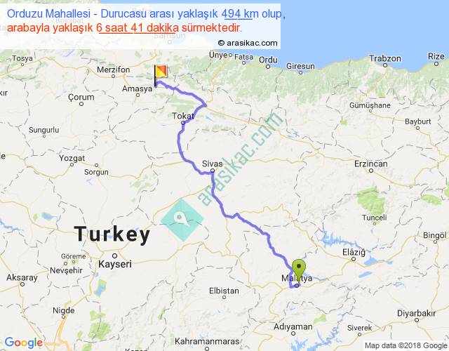 Orduzu Mahallesi - Durucasu arası yaklaşık olarak 90 km/h ile yukarıda belirtilen sürede olup, iki yerin kuş uçuşu uzaklığı (mesafesi) 326'dir. Eğer belirtilen yerler arasında uçak seferi var ise bu süre uçakla 30 dakika'ya kadar düşebilir. Yolculuk otobüsle 8 saat 41 dakika sürmektedir.