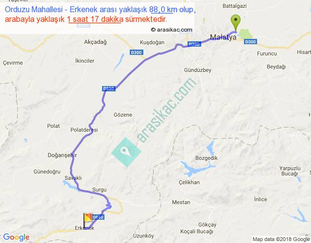 Orduzu Mahallesi - Erkenek arası yaklaşık olarak 90 km/h ile yukarıda belirtilen sürede olup, iki yerin kuş uçuşu uzaklığı (mesafesi) 61'dir. Yolculuk otobüsle 1 saat 40 dakika sürmektedir.