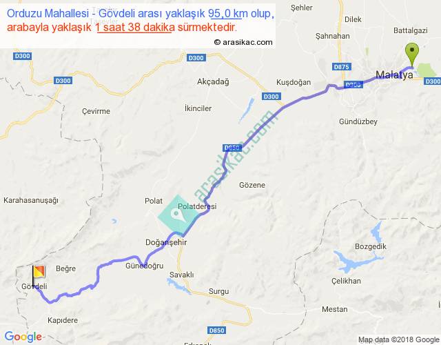 Orduzu Mahallesi - Gövdeli arası yaklaşık olarak 90 km/h ile yukarıda belirtilen sürede olup, iki yerin kuş uçuşu uzaklığı (mesafesi) 76'dir. Yolculuk otobüsle 2 saat 7 dakika sürmektedir.