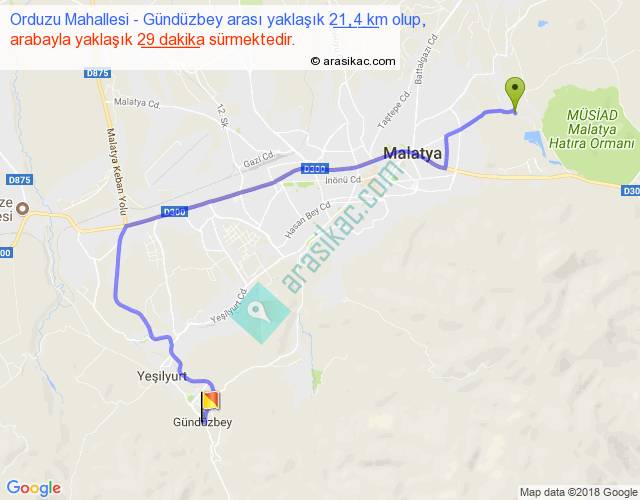 Orduzu Mahallesi - Gündüzbey arası yaklaşık olarak 90 km/h ile yukarıda belirtilen sürede olup, iki yerin kuş uçuşu uzaklığı (mesafesi) 13'dir. Yolculuk otobüsle 37 dakika sürmektedir.