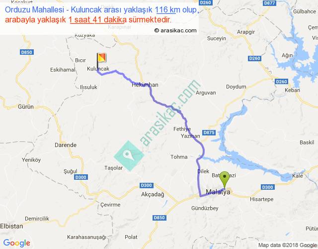 Orduzu Mahallesi - Kuluncak arası yaklaşık olarak 90 km/h ile yukarıda belirtilen sürede olup, iki yerin kuş uçuşu uzaklığı (mesafesi) 83'dir. Yolculuk otobüsle 2 saat 11 dakika sürmektedir.