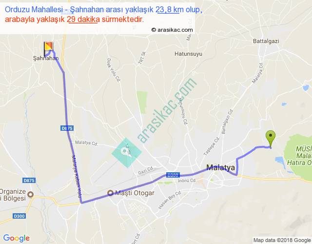 Orduzu Mahallesi - Şahnahan arası yaklaşık olarak 90 km/h ile yukarıda belirtilen sürede olup, iki yerin kuş uçuşu uzaklığı (mesafesi) 15'dir. Yolculuk otobüsle 37 dakika sürmektedir.