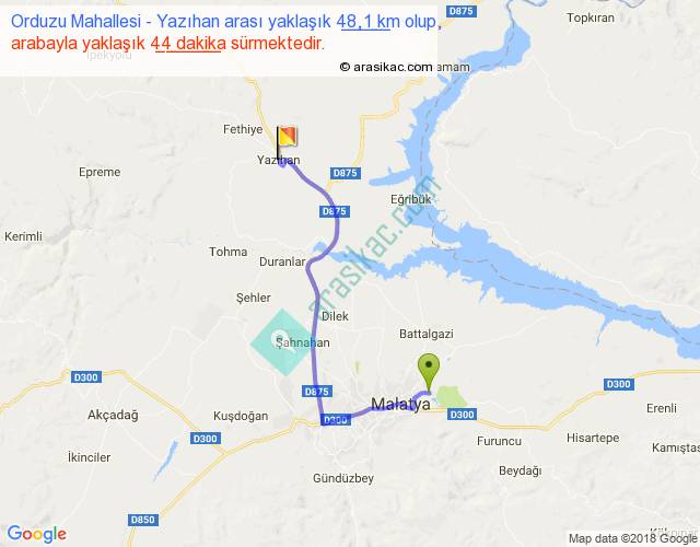 Orduzu Mahallesi - Yazıhan arası yaklaşık olarak 90 km/h ile yukarıda belirtilen sürede olup, iki yerin kuş uçuşu uzaklığı (mesafesi) 30'dir. Yolculuk otobüsle 57 dakika sürmektedir.