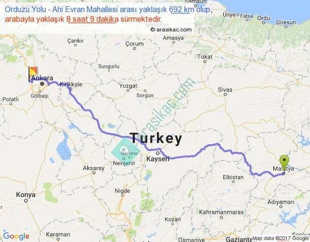 Orduzu Yolu - Ahi Evran Mahallesi arası yaklaşık olarak 90 km/h ile yukarıda belirtilen sürede olup, iki yerin kuş uçuşu uzaklığı (mesafesi) 526'dir. Eğer belirtilen yerler arasında uçak seferi var ise bu süre uçakla 48 dakika'ya kadar düşebilir. Yolculuk otobüsle 10 saat 35 dakika sürmektedir.
