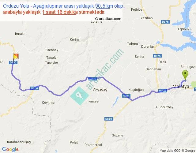 Orduzu Yolu - Aşağıulupınar arası yaklaşık olarak 90 km/h ile yukarıda belirtilen sürede olup, iki yerin kuş uçuşu uzaklığı (mesafesi) 67'dir. Yolculuk otobüsle 1 saat 38 dakika sürmektedir.