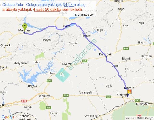 Orduzu Yolu - Gökçe arası yaklaşık olarak 90 km/h ile yukarıda belirtilen sürede olup, iki yerin kuş uçuşu uzaklığı (mesafesi) 243'dir. Yolculuk otobüsle 6 saat 17 dakika sürmektedir.