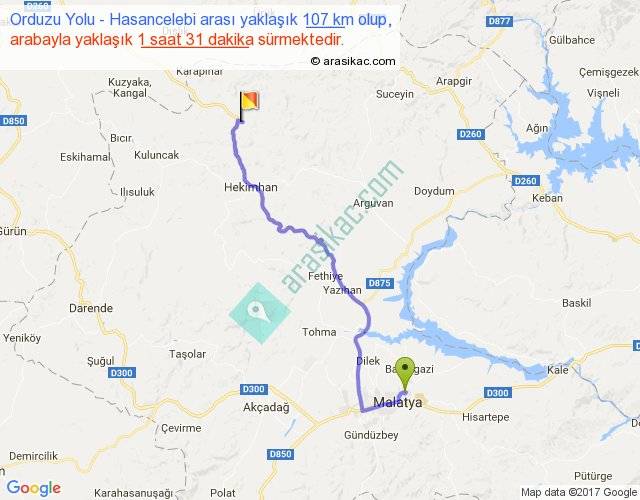 Orduzu Yolu - Hasancelebi arası yaklaşık olarak 90 km/h ile yukarıda belirtilen sürede olup, iki yerin kuş uçuşu uzaklığı (mesafesi) 75'dir. Yolculuk otobüsle 1 saat 58 dakika sürmektedir.