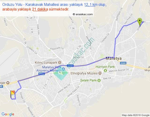Orduzu Yolu - Karakavak Mahallesi arası yaklaşık olarak 90 km/h ile yukarıda belirtilen sürede olup, iki yerin kuş uçuşu uzaklığı (mesafesi) 9'dir. Yolculuk otobüsle 27 dakika sürmektedir.