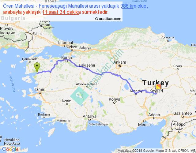 Ören Mahallesi - Feneseaşağı Mahallesi arası yaklaşık olarak 90 km/h ile yukarıda belirtilen sürede olup, iki yerin kuş uçuşu uzaklığı (mesafesi) 745'dir. Eğer belirtilen yerler arasında uçak seferi var ise bu süre uçakla 1 saat 08 dakika'ya kadar düşebilir. Yolculuk otobüsle 15 saat 2 dakika sürmektedir.
