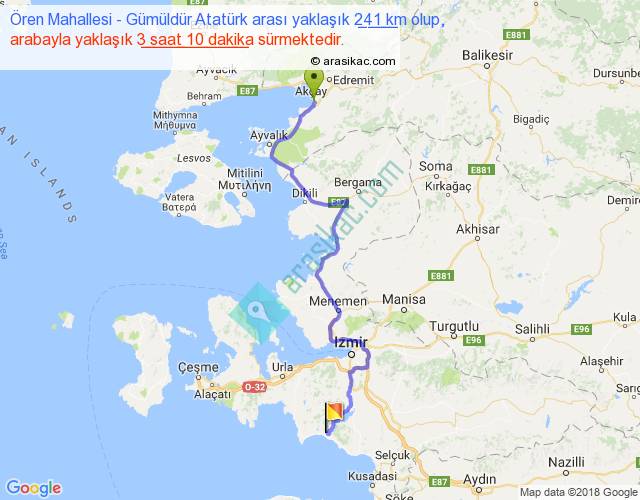 Ören Mahallesi - Gümüldür Atatürk arası yaklaşık olarak 90 km/h ile yukarıda belirtilen sürede olup, iki yerin kuş uçuşu uzaklığı (mesafesi) 157'dir. Yolculuk otobüsle 4 saat 7 dakika sürmektedir.