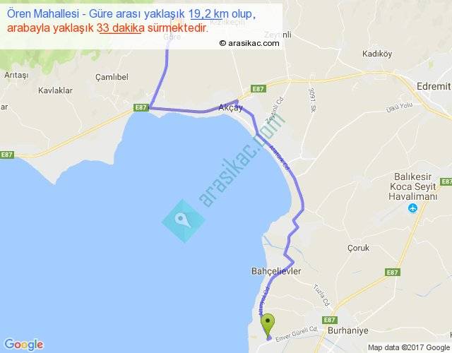 Ören Mahallesi - Güre arası yaklaşık olarak 90 km/h ile yukarıda belirtilen sürede olup, iki yerin kuş uçuşu uzaklığı (mesafesi) 13'dir. Yolculuk otobüsle 42 dakika sürmektedir.