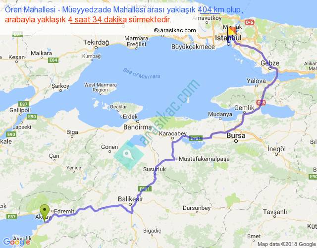Ören Mahallesi - Müeyyedzade Mahallesi arası yaklaşık olarak 90 km/h ile yukarıda belirtilen sürede olup, iki yerin kuş uçuşu uzaklığı (mesafesi) 241'dir. Yolculuk otobüsle 5 saat 56 dakika sürmektedir.