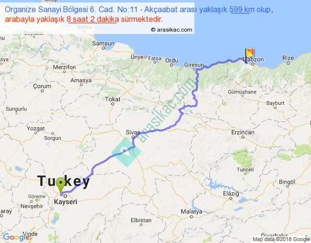 Organize Sanayi Bölgesi 6. Cad. No:11 - Akçaabat arası yaklaşık olarak 90 km/h ile yukarıda belirtilen sürede olup, iki yerin kuş uçuşu uzaklığı (mesafesi) 437'dir. Eğer belirtilen yerler arasında uçak seferi var ise bu süre uçakla 40 dakika'ya kadar düşebilir. Yolculuk otobüsle 10 saat 26 dakika sürmektedir.