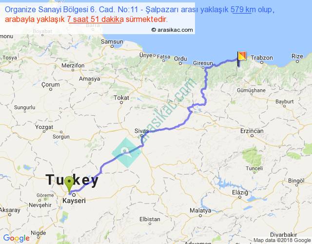 Organize Sanayi Bölgesi 6. Cad. No:11 - Şalpazarı arası yaklaşık olarak 90 km/h ile yukarıda belirtilen sürede olup, iki yerin kuş uçuşu uzaklığı (mesafesi) 406'dir. Eğer belirtilen yerler arasında uçak seferi var ise bu süre uçakla 37 dakika'ya kadar düşebilir. Yolculuk otobüsle 10 saat 12 dakika sürmektedir.