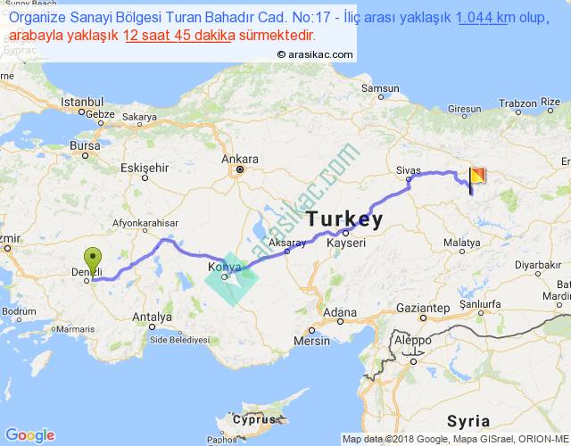 Organize Sanayi Bölgesi Turan Bahadır Cad. No:17 - İliç arası yaklaşık olarak 90 km/h ile yukarıda belirtilen sürede olup, iki yerin kuş uçuşu uzaklığı (mesafesi) 824'dir. Eğer belirtilen yerler arasında uçak seferi var ise bu süre uçakla 1 saat 16 dakika'ya kadar düşebilir. Yolculuk otobüsle 16 saat 34 dakika sürmektedir.