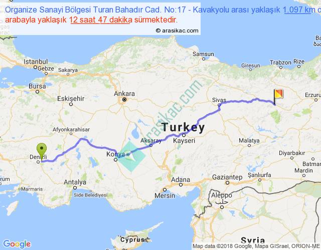 Organize Sanayi Bölgesi Turan Bahadır Cad. No:17 - Kavakyolu arası yaklaşık olarak 90 km/h ile yukarıda belirtilen sürede olup, iki yerin kuş uçuşu uzaklığı (mesafesi) 905'dir. Eğer belirtilen yerler arasında uçak seferi var ise bu süre uçakla 1 saat 23 dakika'ya kadar düşebilir. Yolculuk otobüsle 16 saat 37 dakika sürmektedir.