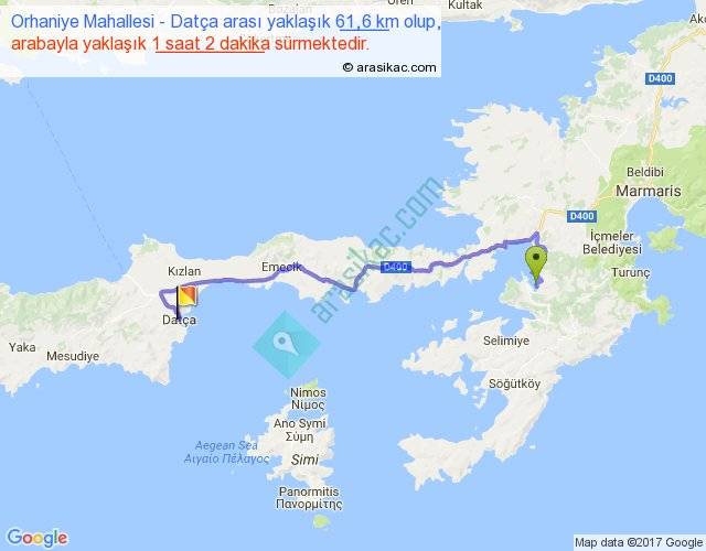 Orhaniye Mahallesi - Datça arası yaklaşık olarak 90 km/h ile yukarıda belirtilen sürede olup, iki yerin kuş uçuşu uzaklığı (mesafesi) 40'dir. Yolculuk otobüsle 1 saat 20 dakika sürmektedir.