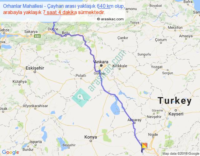 Orhanlar Mahallesi - Çayhan arası yaklaşık olarak 90 km/h ile yukarıda belirtilen sürede olup, iki yerin kuş uçuşu uzaklığı (mesafesi) 481'dir. Eğer belirtilen yerler arasında uçak seferi var ise bu süre uçakla 44 dakika'ya kadar düşebilir. Yolculuk otobüsle 9 saat 11 dakika sürmektedir.