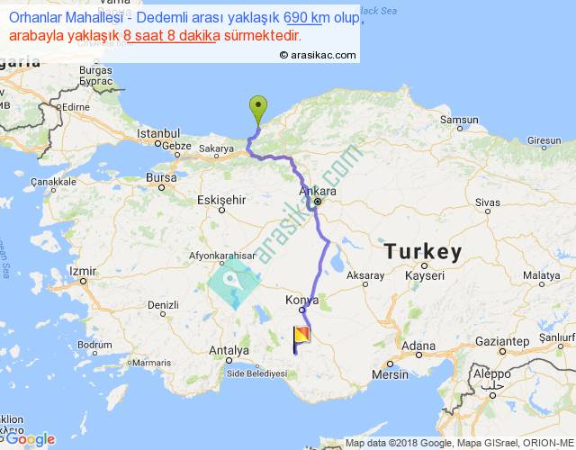 Orhanlar Mahallesi - Dedemli arası yaklaşık olarak 90 km/h ile yukarıda belirtilen sürede olup, iki yerin kuş uçuşu uzaklığı (mesafesi) 478'dir. Eğer belirtilen yerler arasında uçak seferi var ise bu süre uçakla 44 dakika'ya kadar düşebilir. Yolculuk otobüsle 10 saat 34 dakika sürmektedir.