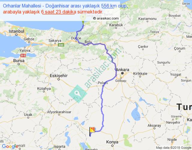 Orhanlar Mahallesi - Doğanhisar arası yaklaşık olarak 90 km/h ile yukarıda belirtilen sürede olup, iki yerin kuş uçuşu uzaklığı (mesafesi) 348'dir. Eğer belirtilen yerler arasında uçak seferi var ise bu süre uçakla 32 dakika'ya kadar düşebilir. Yolculuk otobüsle 8 saat 17 dakika sürmektedir.