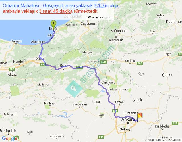 Orhanlar Mahallesi - Gökçeyurt arası yaklaşık olarak 90 km/h ile yukarıda belirtilen sürede olup, iki yerin kuş uçuşu uzaklığı (mesafesi) 201'dir. Yolculuk otobüsle 4 saat 52 dakika sürmektedir.
